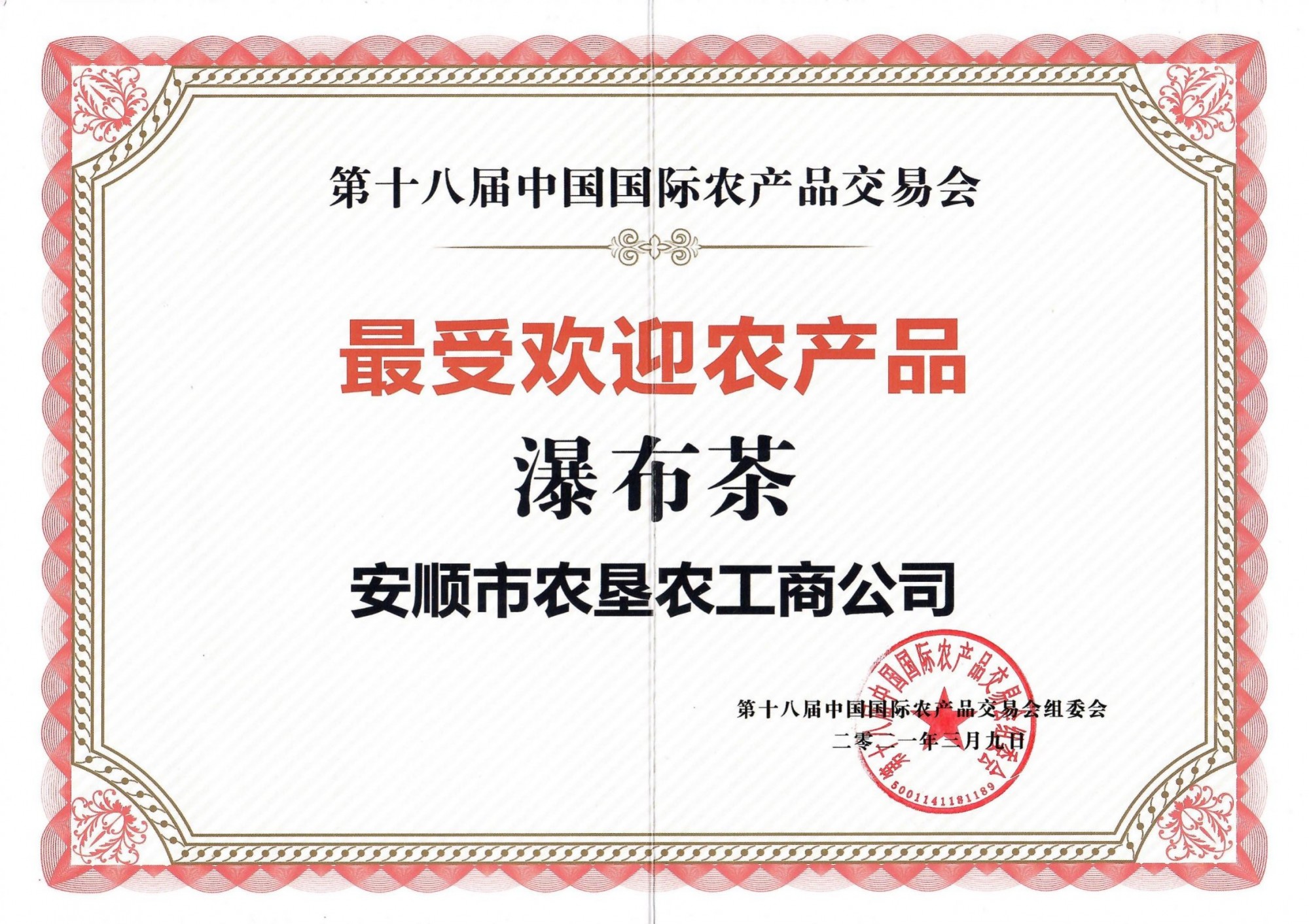 | 發(fā)證機(jī)構(gòu): | 第十八屆中國國際農(nóng)產(chǎn)品交易會組委會 | 發(fā)證時間 : | 2021-03-09 |