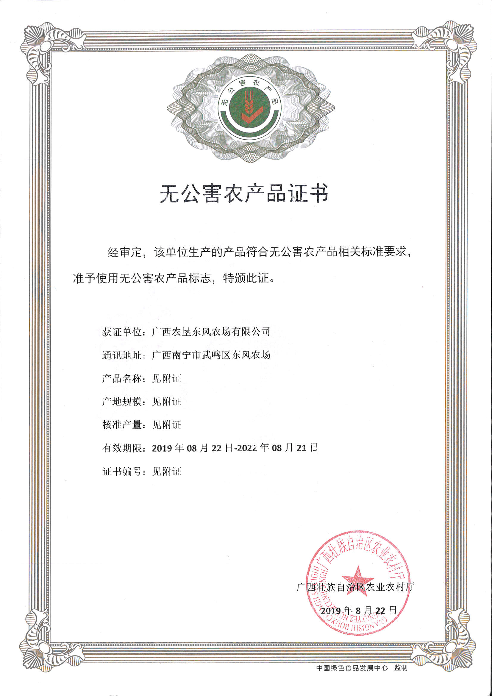 發證機構:   廣西壯族自治區農業農村廳 發證時間 :   2019-08-22