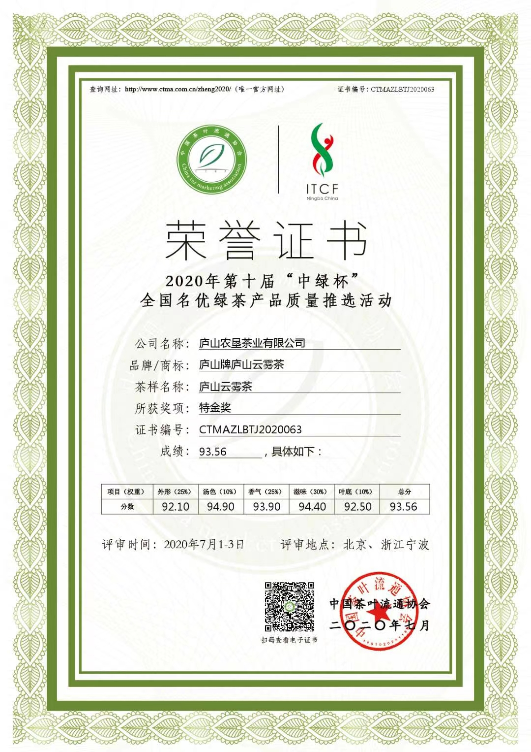 證書介紹 2020年第十屆“中綠杯”金國(guó)名優(yōu)綠茶產(chǎn)品質(zhì)量推選活動(dòng) 榮獲 特金獎(jiǎng) 證書圖片 |