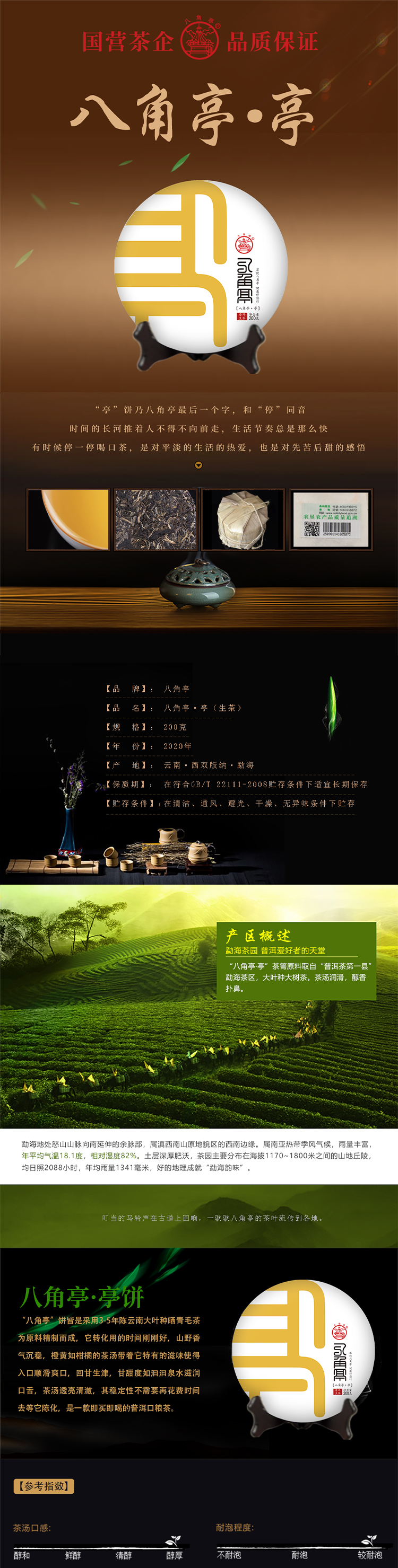 八角亭茶業原為黎明農工商聯合公司(黎明農場)下屬茶葉加工組,始于一九六四年,從事茶葉產品開發生產五十余載,一九八四年建成標準化工廠,二00一年開始生產普洱茶,截止到2013年,公司累計生產各種普洱茶數百個品種共12000余噸。