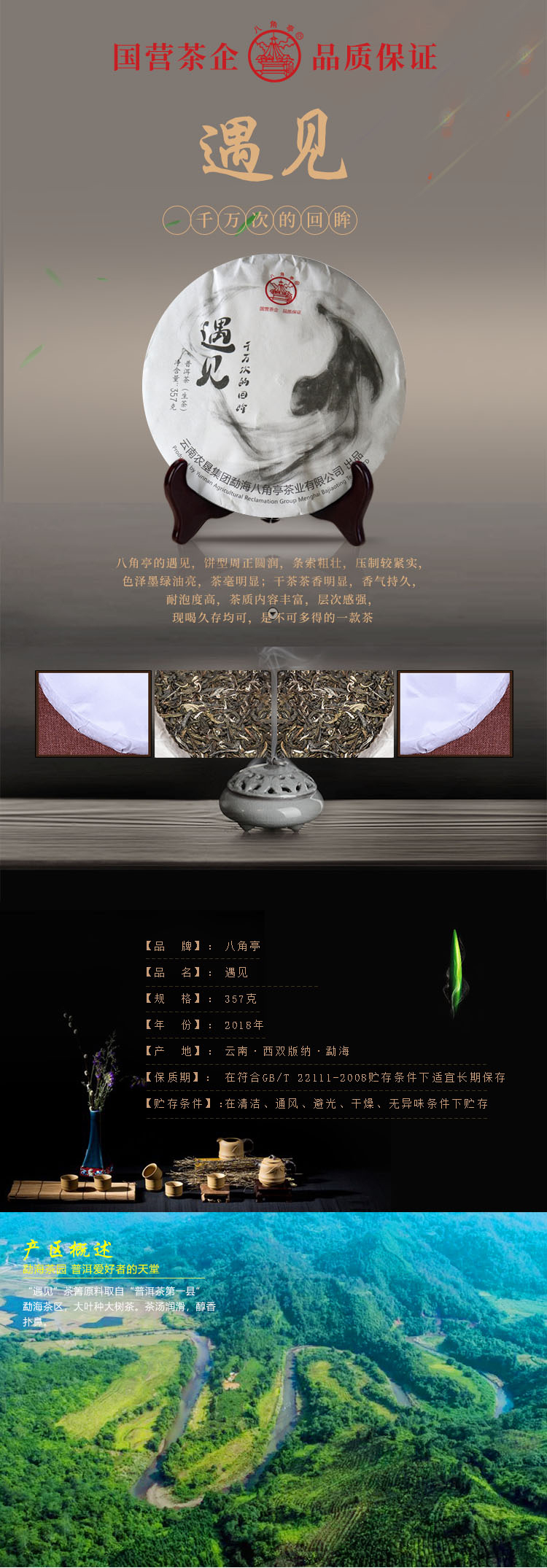 云墾茶業(yè)集團(tuán)下屬茶葉生產(chǎn)企業(yè)——云南農(nóng)墾集團(tuán)勐海八角亭茶業(yè)有限公司原名黎明茶廠,是我國(guó)歷史最為悠久的茶企之一,曾位列“中國(guó)普洱茶十大知名品牌”“十大最受歡迎茶葉品牌”、“中國(guó)普洱茶十大暢銷(xiāo)品牌”中,成為今天市場(chǎng)上最有影響力的品牌之一。公司產(chǎn)品獲得“綠色食品”、ISO9001、 HACCP和云茶品牌(YC)4項(xiàng)認(rèn)證,連續(xù)獲得“云南名牌農(nóng)產(chǎn)品”“云南名牌產(chǎn)品”“云南省著名商標(biāo)”等品牌榮譽(yù),公司生產(chǎn)的多款普洱茶在歷次專(zhuān)業(yè)評(píng)比中多次獲得特等金獎(jiǎng)和金獎(jiǎng)。在2018第五屆中國(guó)企業(yè)五星品牌論壇上,云南農(nóng)墾集團(tuán)勐海八角亭茶業(yè)有限公司上榜中國(guó)普洱茶行業(yè)影響力品牌——“金芽獎(jiǎng)”,公司負(fù)責(zé)人陳勝軍先生獲“陸羽獎(jiǎng)”,被授予2017“國(guó)際十大杰出茶人”榮譽(yù)稱(chēng)號(hào)。